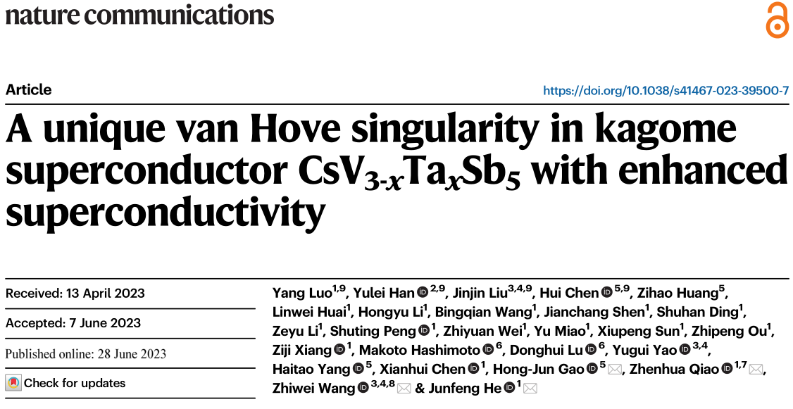 近日,北京理工大學物理學院王秩偉研究員、姚裕貴教授團隊,與中國科學技術大學何俊峰教授、喬振華教授,以及中科院物理研究所高鴻鈞院士等人合作在《自然通訊》(Nature Communications)發表了對籠目結構超導材料CsV3-xTaxSb5中范霍夫奇點(von Hove Singularity, VHS)的研究。