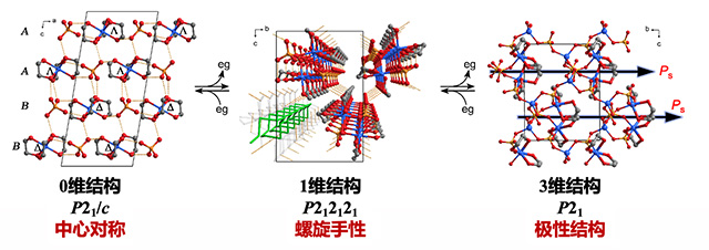 該課題組在前期通過(guò)分子指向變化調(diào)控材料力、磁物理性質(zhì)等相關(guān)工作的研究基礎(chǔ)上( Nat. Chem. , 2014, 6, 1079-1083; Nat. Commum. 2019, 10, 4805-4812; Angew. Chem., Int. Ed. 2017, 56, 717-721),結(jié)合近期通過(guò)客體分子誘導(dǎo)晶格變化的相關(guān)報(bào)道,提出通過(guò)剝離弱螯合配體驅(qū)動(dòng)單晶到單晶轉(zhuǎn)變的研究思路,獲得了首例基于簡(jiǎn)單螯合配體脫離、晶體結(jié)構(gòu)縮合誘導(dǎo)的巨大并且可逆的單晶到單晶轉(zhuǎn)變。通過(guò)乙二醇螯合配體的兩步脫離/吸附,該材料體積可逆伸縮高達(dá)50%,質(zhì)量可逆交換36%,體積與質(zhì)量變化均達(dá)到目前文獻(xiàn)報(bào)道單晶到單晶轉(zhuǎn)變的最大值。同時(shí)螯合配體脫離過(guò)程中,金屬中心相鄰配位點(diǎn)空間釋放,分子手性發(fā)生反轉(zhuǎn),對(duì)應(yīng)單晶材料經(jīng)歷中心對(duì)稱—螺旋手性結(jié)構(gòu)—極性結(jié)構(gòu)的兩步可逆對(duì)稱性變化。該對(duì)稱性變化通過(guò)單晶X-射線衍射、變溫二階非線性光學(xué)以及CD光譜進(jìn)行了詳細(xì)的表征。通過(guò)比照單晶結(jié)構(gòu)對(duì)稱性的轉(zhuǎn)變,作者對(duì)該結(jié)構(gòu)變化的分子運(yùn)動(dòng)機(jī)理進(jìn)行了深入的分析。這種具有類凝膠性質(zhì)的單晶材料為柔性分子基單晶材料的合成提供了新的思路,同時(shí)基于螯合配體脫離驅(qū)動(dòng)的分子手性變化為新型手性配合物的合成提供了可能的途徑。