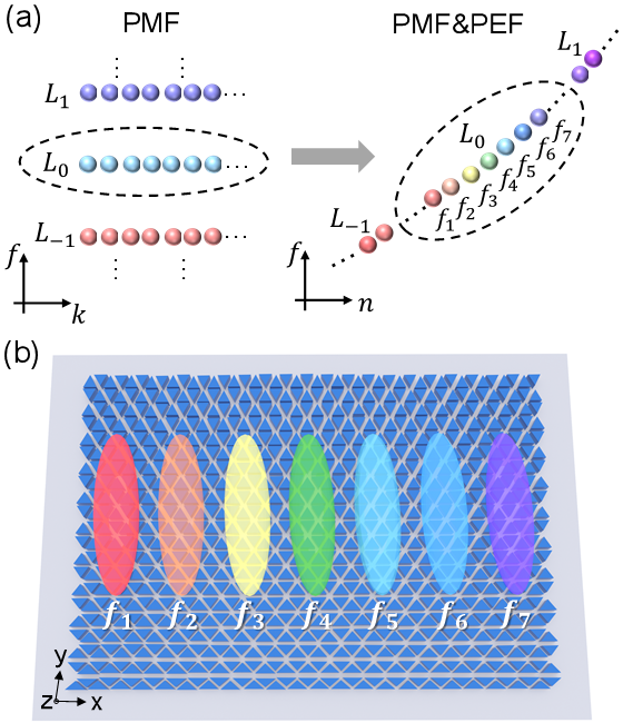 圖1. (a, b)贗磁場和贗電場協同作用下誘導的朗道彩虹現象示意圖,不同頻率的朗道零模被分開并局域到不同的空間位置。