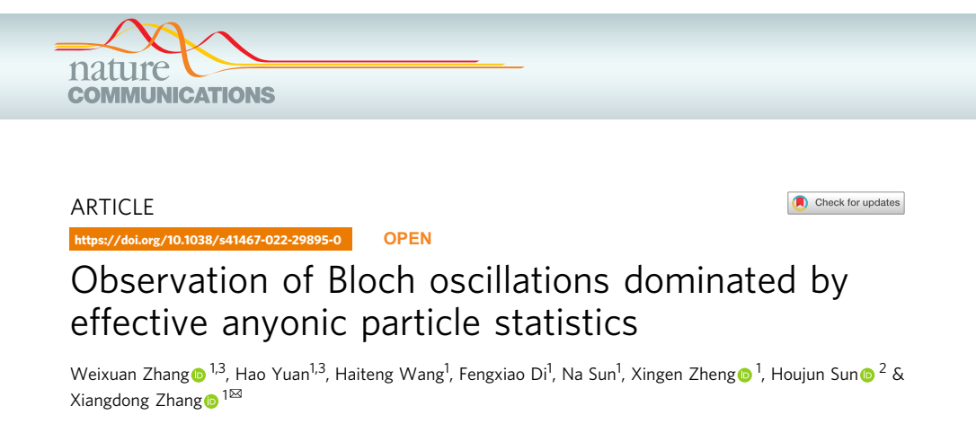 我們知道玻色子遵從玻色統計,費米子遵從費米統計。除了玻色子和費米子,大約四十年前,科學家提出具有介于玻色子和費米子之間統計關系的準粒子,被稱為任意子。具體來講,當交換兩個任意子的空間位置時,系統波函數會獲得一個介于0到π的相位。科學家研究發現,雙體任意子系統可以展現與統計相關的布洛赫振蕩行為。雖然理論結果顯示贗費米子振蕩周期是玻色子的兩倍,但處于中間統計角(0<統計角<π)的任意子布洛赫振蕩現象還沒有被揭示。更重要的是,由于問題的復雜性,有關任意子布洛赫振蕩的實驗觀察還從來沒有實現。