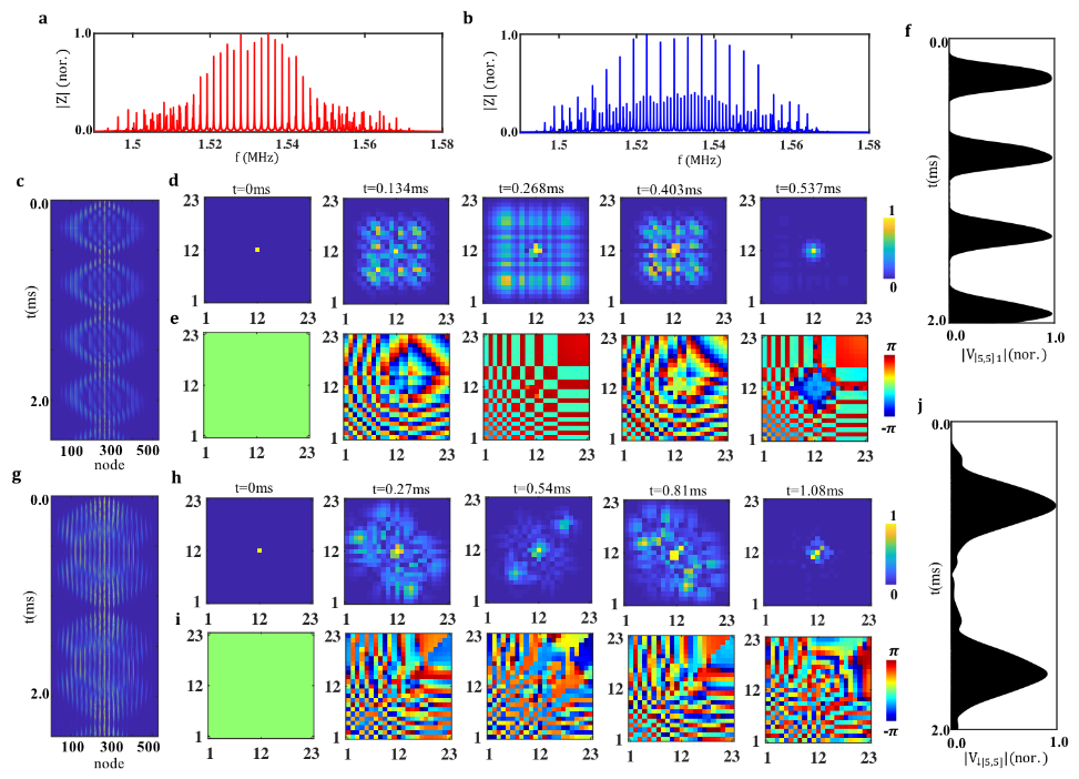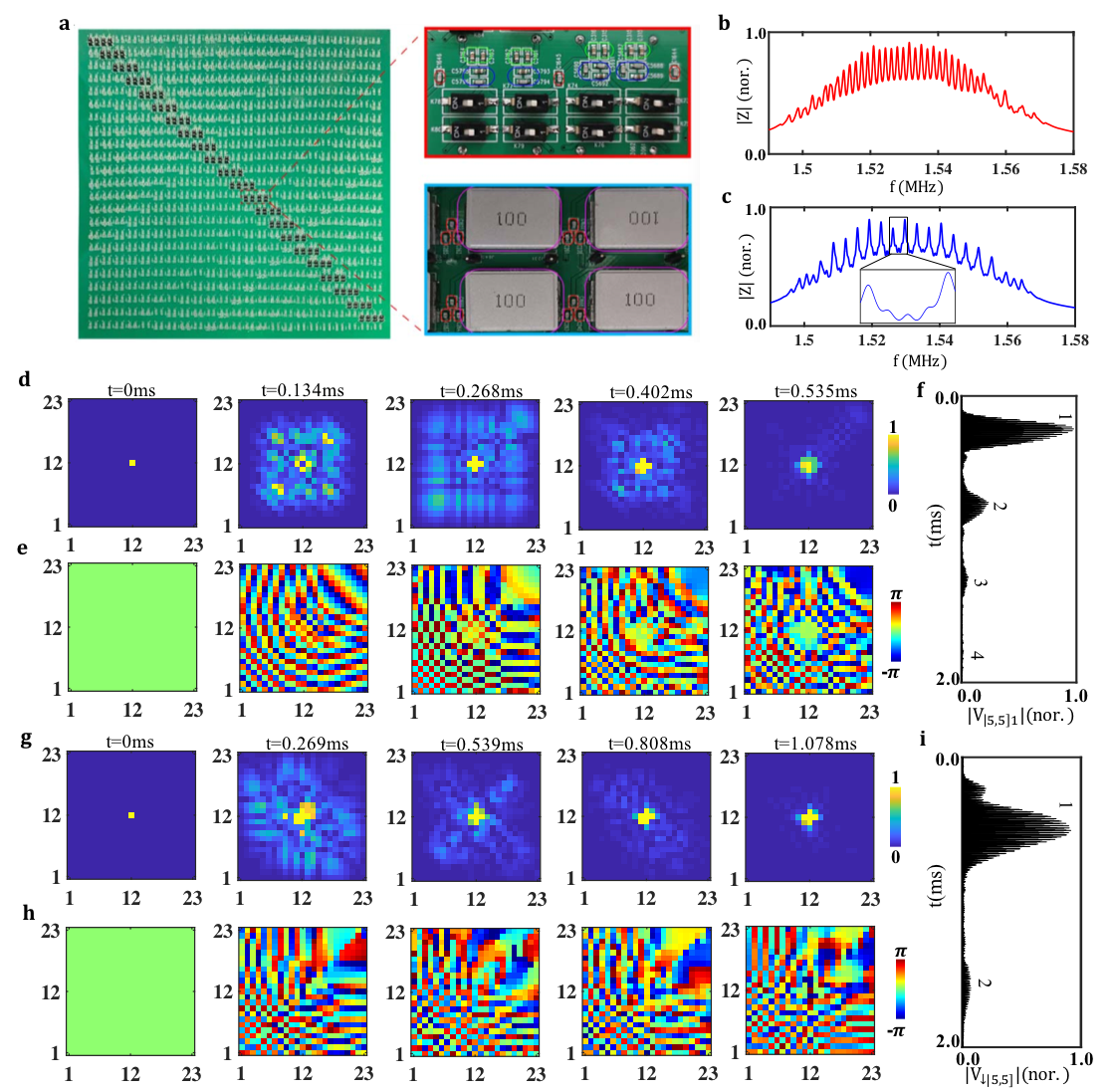 圖2和圖3中的理論仿真和實驗測量進一步驗證了電路網絡的有效性。圖3a顯示的是電路網絡的樣品圖。首先,頻域的阻抗測量可以清楚的展現電路網絡的等間距能譜,并且頻率間隔滿足玻色子-電路網絡為贗費米-電路網絡的兩倍(圖2a,2b和圖3b,3c)。時域仿真和測量的結果進一步展現了由統計決定的布洛赫振蕩現象,并且與雙體-任意子的一維晶格模型一致。圖2c和2g顯示了仿真結果中所有電路格點的電壓信號隨時間的演化行為。可以清晰的看出,在經典電路網絡中電壓信號也發生了周期性振蕩的現象。贗費米-電路網絡的振蕩周期是玻色子-電路網絡的兩倍。為了更直觀的展現電壓信號的振蕩行為,圖2b(2e)與2h(2i)分別展現了激發點電壓的振幅(相位)在不同時刻的空間分布。可以看到,玻色子-電路網絡中電壓相位的對稱分布與贗費米-電路網絡中電壓相位的反對稱分布與量子統計所決定的波函數特性一致。相應的實驗結果展現在圖3d(3e)和3g(3h)中,其與仿真結果相吻合。最后,數值計算的單格點電壓信號在玻色子-電路網絡(贗費米-電路網絡)的振蕩行為顯示在圖2f(2j)。相應的實驗結果顯示在圖3f(3i)中。進一步可以看出,贗費米-電路網絡的振蕩周期是玻色子-電路網絡的兩倍。實驗中振蕩電壓信號的顯著衰減的是由電路中的損耗引起的。最后,研究者還在理論上指出,通過平衡外加勢場和統計角的競爭關系,具有介于0到π的中間統計角的雙體任意子系統可以展現三倍于雙波色子的振蕩行為。這一新奇的效應,也可以在電路網絡中得以實現。