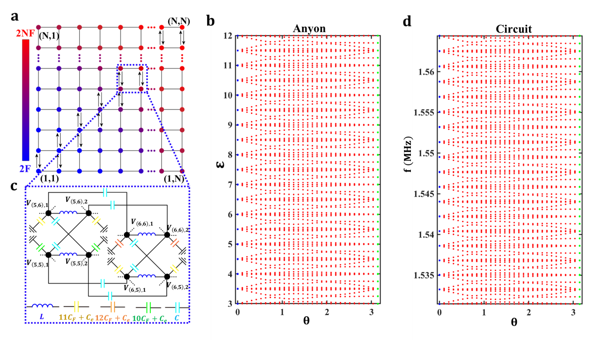圖1. 任意子-電路網絡的設計方案和本征能譜。a和c:等效于一維-雙體任意子模型的二維-單體緊束縛模型及電路設計。b和d:雙體任意子和相應電路網絡的本征能譜。