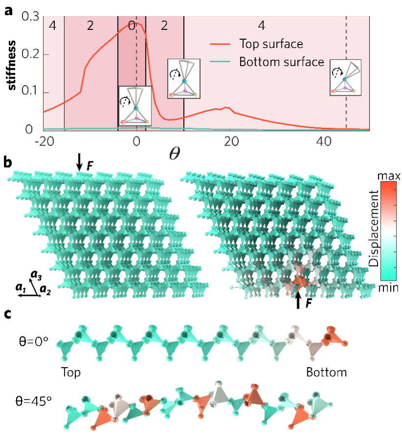 該團隊對廣義焦綠石晶格進行了關于表面力學的數值仿真。圖3(a)表明晶格上下表面的剛度之比在晶格從完全拓撲極化相轉變為外爾相的過程中快速降低。在圖3(b)中,θ=0°的完全拓撲極化相在點外力的作用下展現出強烈不對稱的表面力學響應。圖3(c)則展示了完全拓撲極化的力學軟模與外爾相中的外爾軟模在空間分布上的明顯差別,前者局域于晶格的某一側邊界,后者則貫穿了整個晶格。