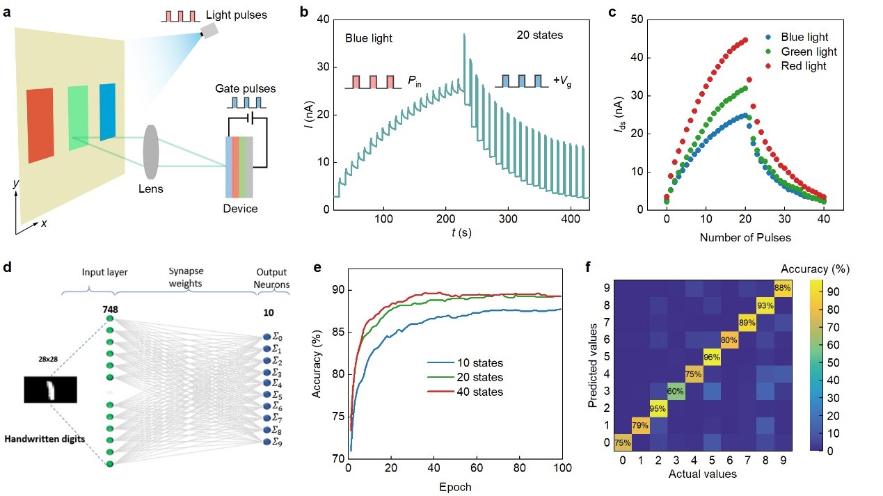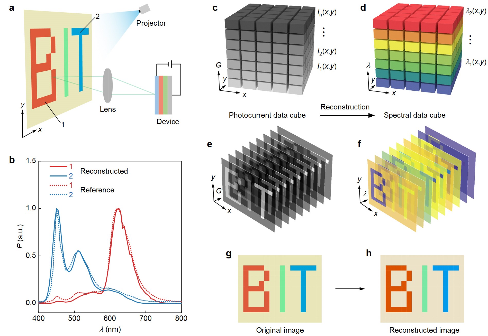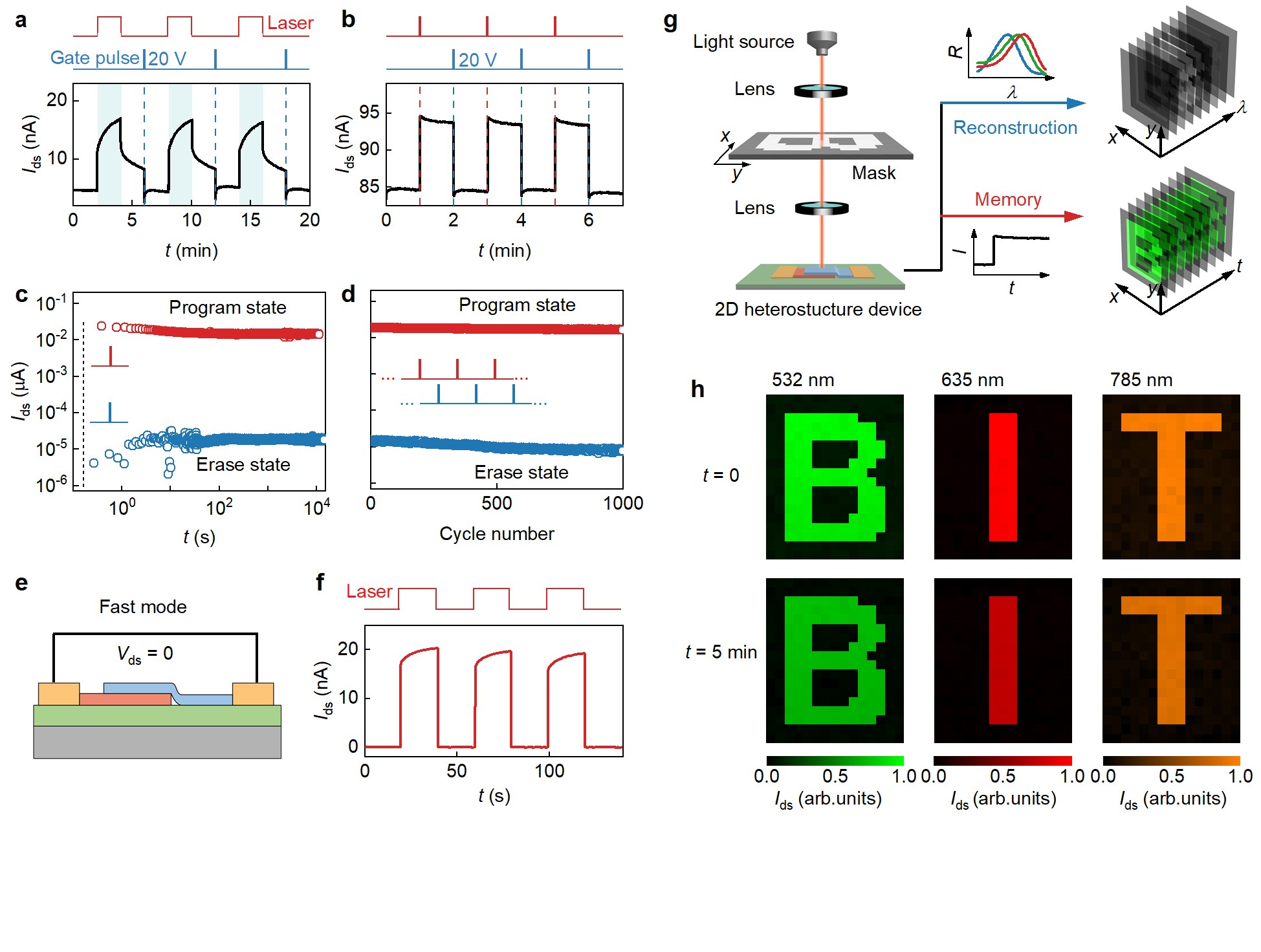 近日,北京理工大學物理學院吳漢春教授研究團隊,與臺灣大學/中原大學張慶瑞教授、高雄科技大學洪冠明教授、以及愛爾蘭圣三一學院Igor V. Shvets教授合作,研制了一種新型范德華異質結光譜儀。該微型光譜儀不僅具有尺寸小 (19微米)、光譜分辨率高(5nm)、光譜響應范圍寬(400nm-nm)、響應速度高的特點,還具有成像、存儲和神經形態計算功能。相關成果以“Miniaturized spectrometer with intrinsic long-term image memory”為題,發表在國際頂級期刊《Nature Communications》上。