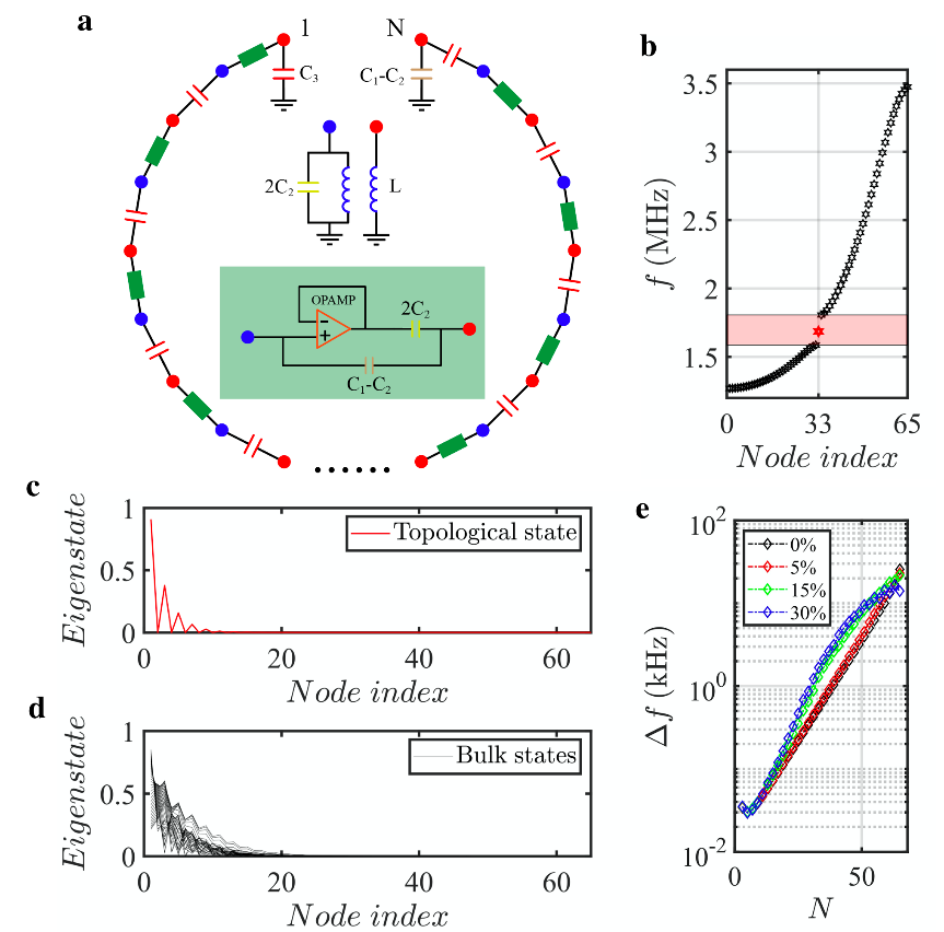研究人員制備了四種不同長度的非厄米拓撲電路,包括N=7、N=11、N=15和N=19。圖2a展示了N=19的電路樣品。通過測量電路阻抗相應,可以得到由邊界擾動導致的電路拓撲零能模頻移,如圖2c所示。四種不同顏色的線與四種不同長度的非厄米拓撲電路相對應,所測得的阻抗響應均位于電路的邊界格點。此外,紅色矩形標注了拓撲帶隙的頻率范圍," 該頻率范圍內的阻抗響應顯示在了圖2d中。其中紅色虛線用來標記開放邊界下電路中拓撲零能模的頻率。上述結果清楚地表明,與拓撲零能模對應的阻抗峰的頻率偏移隨著電路長度的增加而明顯增加,這意味著電路長度的增加將帶來敏感性的顯著增強。圖2e中的藍線進一步說明了測量的頻率偏移和電路長度之間的關系。與之相對應的理論模擬結果(紅線所示)與實驗結果之間有著良好的一致性。