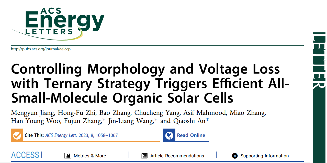 近日,北京理工大學(xué)化學(xué)與化工學(xué)院王金亮教授與安橋石特別研究員課題組在國際頂級期刊ACS Energy Letters(IF:23.9)發(fā)表題目為“Controlling Morphology and Voltage Loss with Ternary Strategy Triggers Efficient All-Small-Molecule Organic Solar Cells”的研究論文。北京理工大學(xué)為第一通訊單位,北京理工大學(xué)安橋石特別研究員、王金亮教授和北京交通大學(xué)張福俊教授為共同通訊作者,碩士研究生蔣夢云為第一作者。