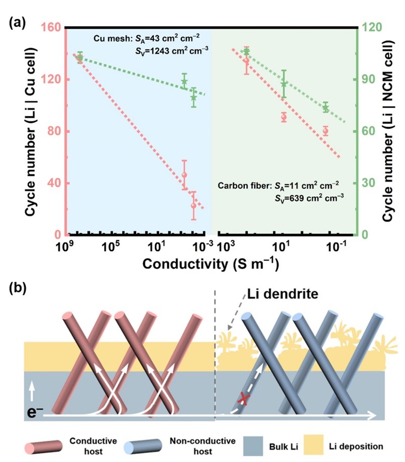 圖1. (a) 不同骨架導電性與電池循環(huán)性能的關系總結(jié)圖;(b) 鋰在導電與不導電骨架上沉積形貌的示意圖。
