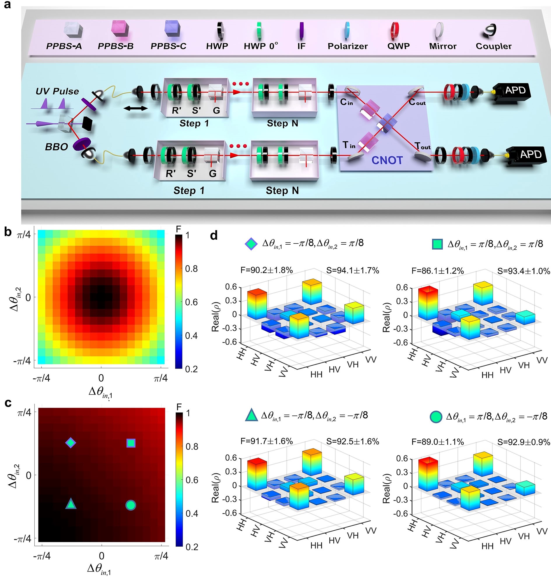 研究人員實(shí)驗(yàn)驗(yàn)證這一糾纏態(tài)產(chǎn)生方案的魯棒性。實(shí)驗(yàn)上在入射前分別對(duì)上下兩路光子加入擾動(dòng)(? / 4,  / 4)來(lái)模擬外界環(huán)境對(duì)入射態(tài)的影響。 如圖4b所示,當(dāng)光子直接傳輸至兩比特門(mén)而未經(jīng)過(guò)量子行走時(shí),只有在幾乎沒(méi)有擾動(dòng)的情況下,保真度才能保持較高的值。然而隨著擾動(dòng)的增加,保真度急劇下降,在圖示的條件下保真度已經(jīng)低于0.5。相反,如圖4c所示,當(dāng)上下兩路光子都經(jīng)過(guò)帶有奇異線的非厄米量子行走時(shí),幾乎所有擾動(dòng)下的保真度都很高。