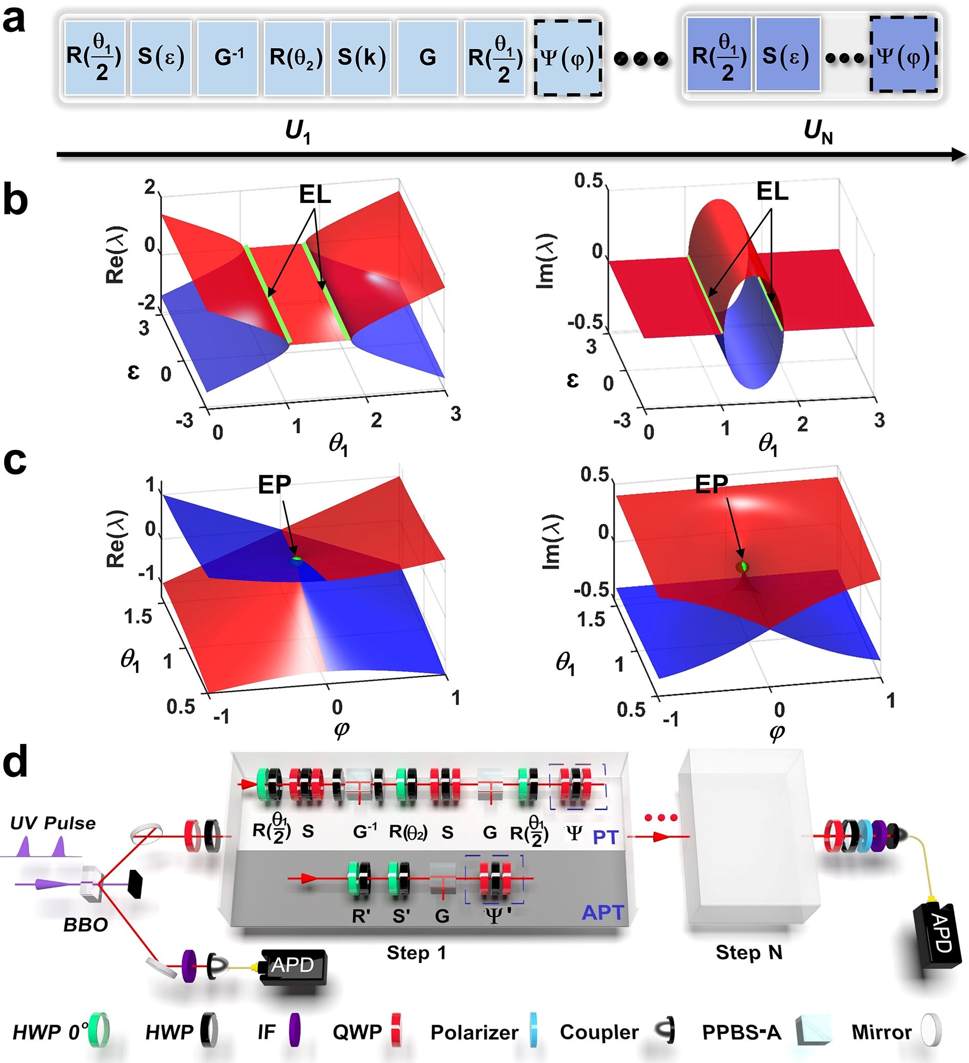 之前的研究都是使用哈密頓量來(lái)描述環(huán)繞奇異點(diǎn)的動(dòng)力學(xué)特性。在該工作中,研究團(tuán)隊(duì)構(gòu)造了非厄米量子行走來(lái)描述環(huán)繞奇異點(diǎn)或奇異線的動(dòng)力學(xué)過(guò)程。如圖1a所示是一個(gè)包含N步的非厄米量子行走系統(tǒng)來(lái)控制量子態(tài)的演化的示意圖,其中第1步(N)的演化過(guò)程由時(shí)間演化算子 U 1 ( U N )描述。這里的非厄米量子行走是由多種算符組成的。以第一步為例,可以表示為1.png。其中旋轉(zhuǎn)算符形式為2.png,相位平移算符為3.png,增益損耗算符為4.png。通過(guò)恰當(dāng)選擇參數(shù),可以得到奇異線,如圖1b所示綠色線。當(dāng)在量子行走中引入算符5.png=6.png(圖1a中的虛框),就可以得到孤立的奇異點(diǎn),如圖1c所示。