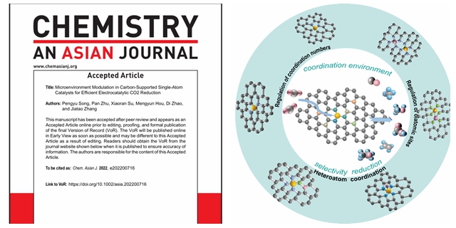 此外,基于該工作,研究生宋鵬宇于2022年8月受邀在《Chemistry An Asian Journal》雜質上發表題為“Microenvironment Modulation in Carbon-Supported Single-Atom Catalysts for Efficient Electrocatalytic CO2 Reduction”的綜述,針對碳基單原子配位調控:包括第一配位殼層、第二及更高配位殼層及雙活性位點調控,應用于電催化二氧化碳還原進行了全面闡述,為應用于電催化二氧化碳還原的單原子催化劑設計提供了獨特見解。