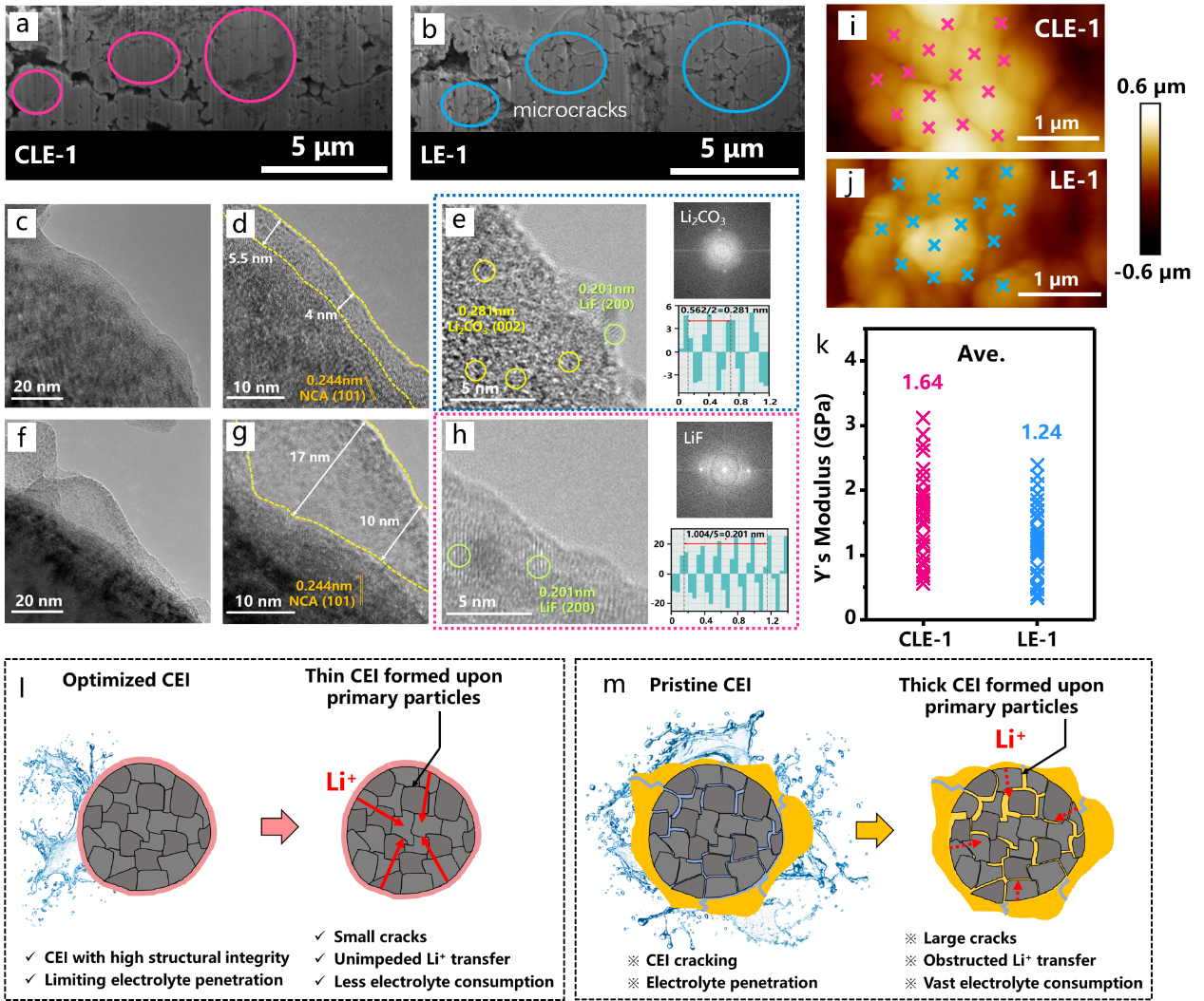 圖2 基于 (a) CLE-1和 (b) LE-1電解液的電池在循環(huán)后NCA正極經(jīng)聚焦離子束切片后的掃描電子顯微圖, (c-e) 基于CLE-1和 (f-h) LE-1電解液的電池循環(huán)后NCA正極在不同放大倍率下的透射電子顯微圖 (分別包含LiF和Li2CO3晶格的傅里葉變換圖和對比度曲線圖), 基于 (i) CLE-1 和 (j) LE-1電解液的電池在循環(huán)后NCA正極的原子力顯微圖, (k) 原子力顯微測試收集到的相應(yīng)楊氏模量, (i-m) 兩種電解液環(huán)境下NCA顆粒結(jié)構(gòu)演化示意圖。