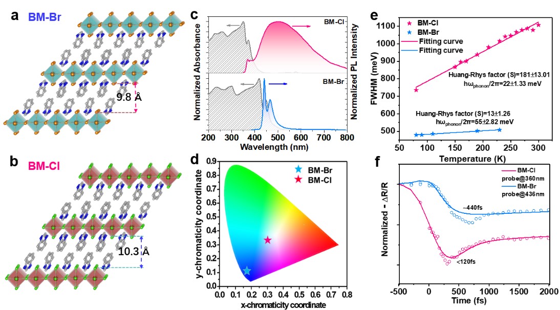 BM-Br晶體具有弱的電子-聲子耦合效應(yīng),其體現(xiàn)電子-聲子耦合強(qiáng)度的“黃-里斯(Huang?Rhys)”因子S="13,在室溫下產(chǎn)生深藍(lán)色的窄帶光致發(fā)光;而BM-Cl晶體在室溫下處呈現(xiàn)由于強(qiáng)電子-聲子耦合導(dǎo)致的STE寬帶白光發(fā)射,其S="181,這是目前所有塊體半導(dǎo)體材料中的最高值(圖 2)。因此,本工作揭示了鹵素對二維鈣鈦礦STE發(fā)射的內(nèi)在的調(diào)控機(jī)制:除了改變晶格形變勢能和自俘獲STE的勢能外,鹵素取代使BM-Cl晶體中電子-聲子耦合增強(qiáng)高達(dá)十倍,從而影響了STE的動(dòng)力學(xué)。這為調(diào)控低維鈣鈦礦中的電子-聲子耦合強(qiáng)度提供了一個(gè)通用可行的新思路。
