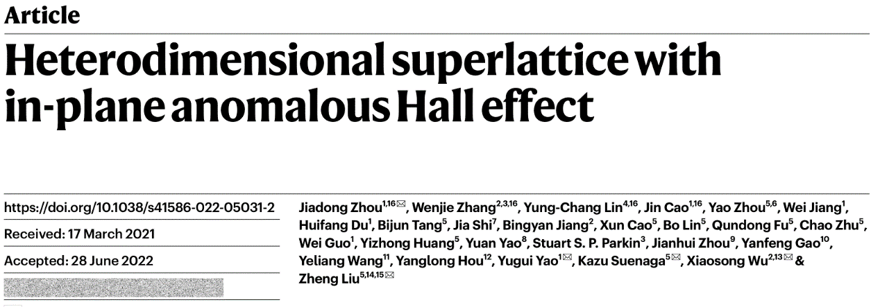 該工作首次利用CVD法成功制備了一種由不同維度物質(zhì)組成的異維超晶格結構VS2-VS,并在該超晶格結構中首次觀測到了室溫下面內(nèi)反?;魻栃1疚牡难芯抗ぷ鞑粌H實現(xiàn)了不同維度超晶格結構的合成,開拓了超晶格體系,更進一步觀測到基于該體系的面內(nèi)大反常霍爾效應,為凝聚態(tài)物理的研究開辟了新的道路,這對于下一步研究并探索電學、磁學等新奇物性提供了新的思路。