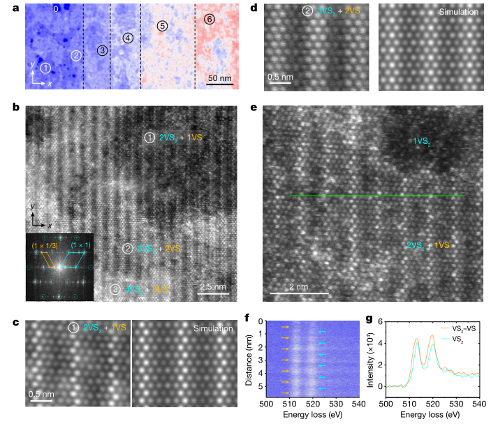圖3 VS2-VS超晶格的原子結構。a, 超晶格的彩色低倍ADF圖。b,超晶格最薄區(qū)域原子分辨率ADF圖。c, d, 放大的超晶格ADF圖及相應模擬圖。e, 2VS2 + 1VS的ADF圖,其中有區(qū)域暴露出單層VS2。 f,EELS 2D光譜圖,取沿e圖中綠色的線掃描。橙色和青色箭頭分別指向VS2 + VS和VS2。g, VS2 + VS(橙色光譜)和VS2(青色光譜)釩 L 邊緣的 EELS 光譜。
