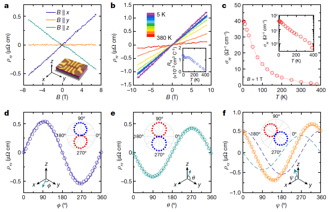 如圖4b所示,不同溫度下的輸運實驗進一步表明,IPHE在室溫下仍然存在 (實驗最高溫度為380 K)。在室溫時,IPHE的霍爾系數(shù)為0.44 × 10?3 cm3 C?1,仍然比面外霍爾效應大。圖4c展示了面內(nèi)霍爾電導率隨溫度呈指數(shù)衰減,據(jù)此可得出約8 meV 的帶隙。角度依賴的霍爾效應研究如圖4d-f所示。當磁場在z-y面內(nèi)旋轉時,由于存在面外磁場分量,而面內(nèi)分量B||y不貢獻,與通常的霍爾效應一樣,霍爾電阻率呈現(xiàn)出正弦曲線。當磁場在x-y面內(nèi)旋轉時,霍爾電阻率在B||x時最大,在B||y時消失,整體也呈現(xiàn)出簡單的正弦曲線。當磁場在z-x面內(nèi)旋轉時,結果顯示為相移后的正弦曲線,它可以被準確的分解為面內(nèi)霍爾效應和面外霍爾效應。這些角度依賴的霍爾輸運結果表明,IPHE只正比于磁場在x方向的投影。