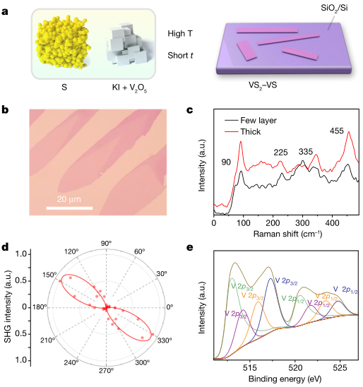 圖1 VS2-VS超晶格生長過程和光學圖像。a, VS2-VS的生長過程。b, VS2-VS 超晶格薄片的光學圖像。c,不同厚度的VS2-VS超晶格的拉曼光譜。d, VS2-VS中SHG強度隨角度的變化曲線。e, VS2-VS超晶格中V 2 p 的XPS光譜。