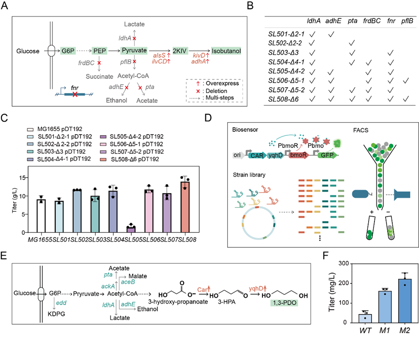 我們使用這些sgRNA突變體開(kāi)發(fā)了基于CRISPR/Cas9的多靶點(diǎn)基因編輯工具箱,可以同時(shí)實(shí)現(xiàn)至多4個(gè)位點(diǎn)的基因敲除以及堿基突變。利用該基因編輯工具箱,我們實(shí)現(xiàn)了底盤細(xì)胞快速工程化改造,得到一系列敲除了不同副途徑的異丁醇生產(chǎn)菌株,并實(shí)現(xiàn)異丁醇高產(chǎn)菌株的構(gòu)建成功將化學(xué)品異丁醇的搖瓶產(chǎn)量提高到了13.9g/L。為了拓展該系統(tǒng)的應(yīng)用范圍,我們利用該工具箱構(gòu)建菌株突變庫(kù),并與本團(tuán)隊(duì)所報(bào)道的生物傳感器BmoR相結(jié)合,篩選得到1,3-PDO高產(chǎn)菌株(圖4),并且與野生型相比突變菌株的產(chǎn)量提高了4.5倍。