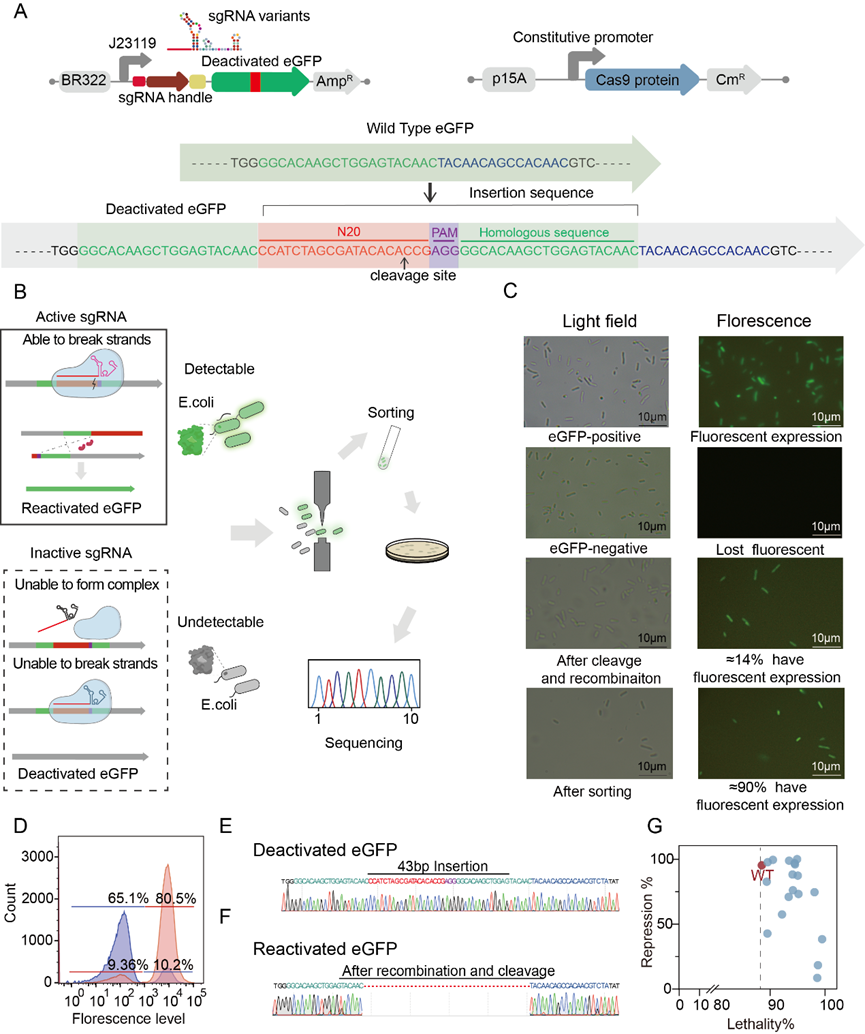 本團(tuán)隊(duì)長(zhǎng)期從事CRISPR系統(tǒng)機(jī)制探究以及高效基因編輯方法學(xué)開(kāi)發(fā),2019年以“CRISPR-Cas9-assisted native end-joining editing offers a simple strategy for efficient genetic engineering in Escherichia coli”為題,在領(lǐng)域頂級(jí)期刊《Applied Microbiology and Biotechnology》上發(fā)表。該工作報(bào)道了一種基于原核體內(nèi)的微同源末端重組系統(tǒng)的CRISPR/Cas9基因編輯方法,是一種最簡(jiǎn)單的基因編輯方法。我們利用該研究的DNA修復(fù)方法設(shè)計(jì)了一種基于生長(zhǎng)和/或熒光激活細(xì)胞分選(FACS)的高通量sgRNA突變體正向篩選系統(tǒng)。我們首先在篩選標(biāo)簽中插入一段可以被識(shí)別的DNA靶點(diǎn)序列,并引入一段同源序列。當(dāng)sgRNA突變體與Cas9蛋白形成二元復(fù)合體,并在有活性的sgRNA突變體引導(dǎo)下結(jié)合至DNA靶點(diǎn)序列形成三元復(fù)合體,激活Cas9蛋白核酸酶活性后,在所設(shè)計(jì)的DNA靶點(diǎn)將會(huì)出現(xiàn)雙鏈斷裂,激活原核細(xì)胞內(nèi)的同源修復(fù)系統(tǒng)。該同源修復(fù)系統(tǒng)利用我們所引入的同源序列進(jìn)行篩選標(biāo)簽的修復(fù),使得細(xì)胞在篩選條件下出現(xiàn)可被篩選的表型,如可在抗性平板上生長(zhǎng)或是通過(guò)流式細(xì)胞儀進(jìn)行分選 (圖2)。
