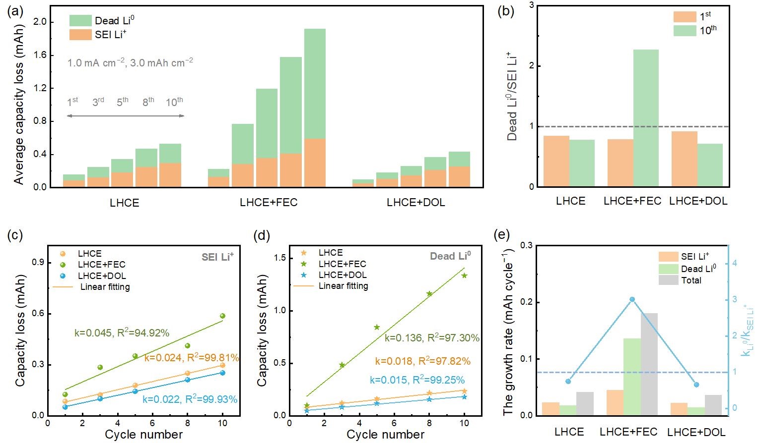 不同的SEI化學(xué)/結(jié)構(gòu)特性直接影響鋰沉積/脫除行為和SEI的動(dòng)態(tài)重構(gòu)過程,進(jìn)而產(chǎn)生不同dead Li0和SEI Li+增長(zhǎng)速率。系統(tǒng)性的研究表明,1,3-二氧環(huán)烷(DOL)介導(dǎo)了均勻有序?qū)訝頢EI的產(chǎn)生,有助于提高鋰金屬沉積的均勻性以及SEI的循環(huán)穩(wěn)定性,同時(shí)降低SEI Li+和dead Li0的增長(zhǎng)速率。