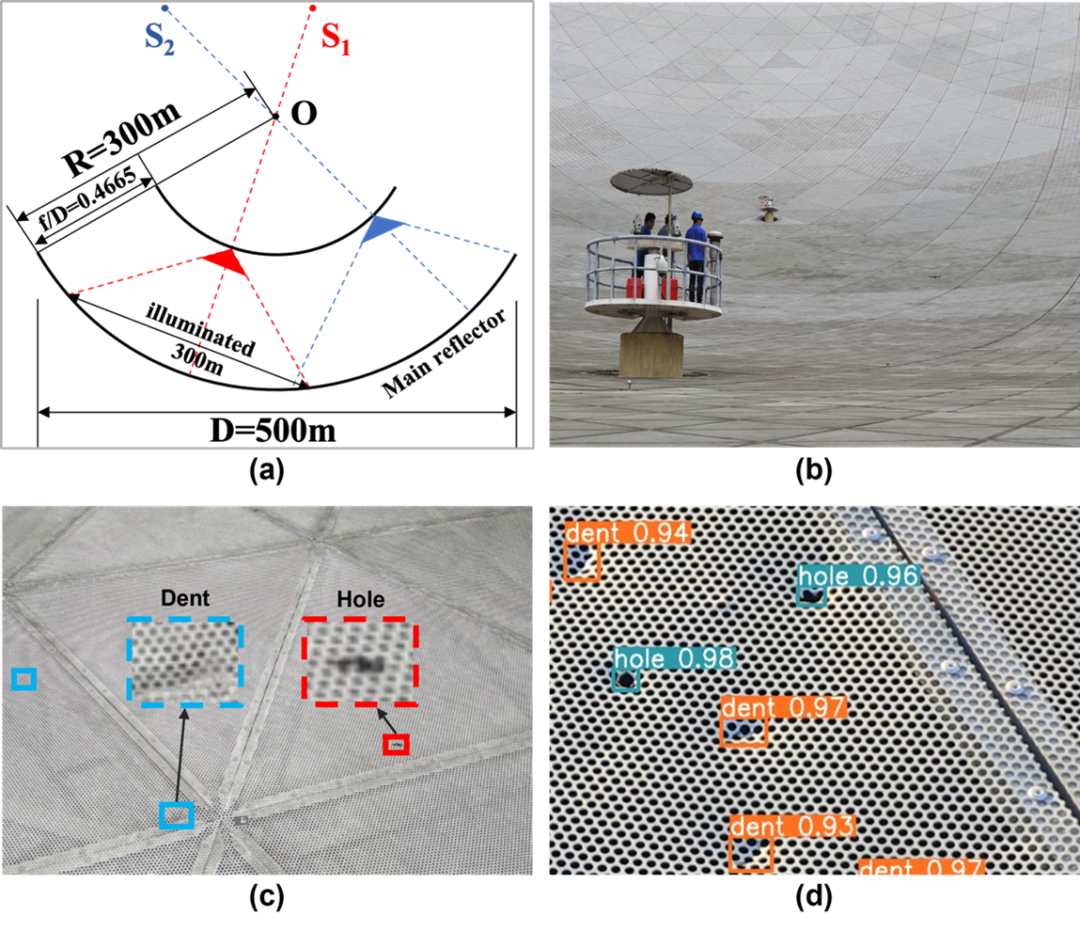 500米口徑球面射電望遠鏡(Five-hundred-meter Aperture Spherical radio Telescope,FAST),又被譽為“中國天眼”,是具有我國自主知識產權、世界最大單口徑、最靈敏的射電望遠鏡。FAST的主體是由4450塊反射面板單元組成的直徑500米球反射面(如圖1a),總面積約25萬平方米。FAST的巨大反射面帶來了前所未有的超高靈敏度,但另一方面容易受到墜石、冰雹等自然墜物所造成的損害,產生凹陷、孔洞等面板缺陷(如圖1c),影響系統運行的可靠性與穩定性。因此,及時準確地發現并修復面板缺陷對于FAST的穩定運行至關重要。傳統面板巡檢主要由巡檢人員定期對反射面板單元進行人工巡檢來實現,因為受面板可承重限制、氣候條件、高空作業危險性等因素的影響,人工巡檢的識別錯誤率高,追溯性差,且效率低下。