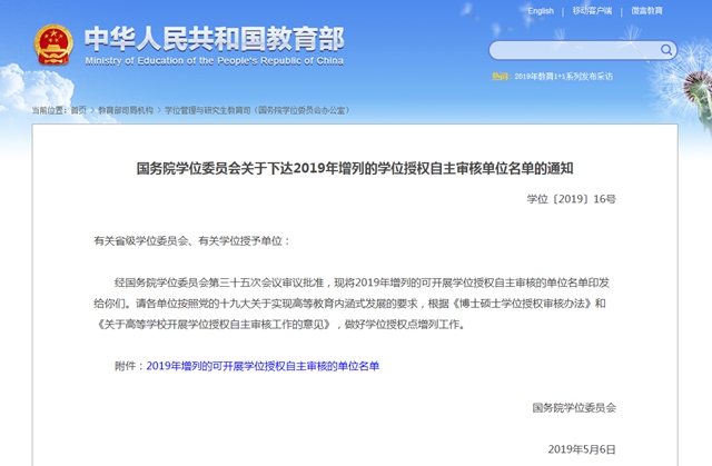 5月31日,國務(wù)院學(xué)位委員會公布了2019年獲得學(xué)位授權(quán)自主審核單位名單,我校名列其中成為全國31所擁有學(xué)位授權(quán)自主審核權(quán)的高校之一。