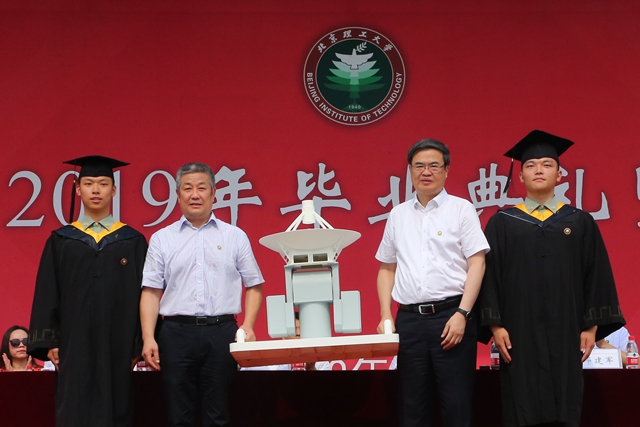 信息與電子學院畢業生代表將我校師生自主設計研制的新型生物探測雷達模型,作為禮物獻給母校,祝愿母校建成一流,續寫輝煌。模型底座長79cm,寓意北京理工大學建校79年來始終以民族復興為己任的品格和精神。趙長祿、張軍接收紀念品,并向畢業生贈送具有學校特色元素的特種鋼材紀念書簽。