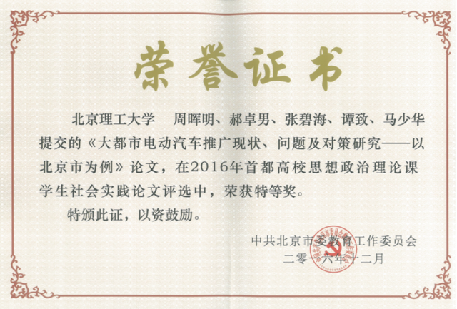 本次活動共收到33所高校提交的157篇學生社會實踐論文,經專家評審,北理工劉新剛老師指導,周暉明、郝卓男、張碧海、譚致、馬少華等撰寫的《大都市電動汽車推廣現狀、問題及對策研究——以北京市為例》論文獲得特等獎(共評出7名特等獎);王娟老師指導,呂佳航、江為宇、張鑫亮、左宏志撰寫的《理工類大學生對創業創新的認識、意向及其原因的調查分析:以首都為中心》論文獲得二等獎,劉新剛獲優秀指導教師獎,北理工榮獲優秀組織獎。北京市教工委專門組織了優秀論文表彰及經驗交流會。