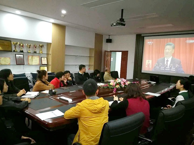 學(xué)院領(lǐng)導(dǎo)班子成員等在信息教學(xué)樓2023會議室集中收看