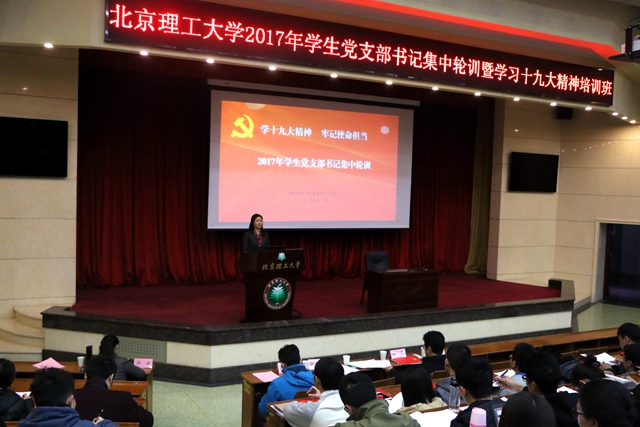 2017年11月4日上午,北京理工大學2017年學生黨支部書記集中輪訓暨學習十九大精神培訓班開班式在中心教學樓報告廳召開,北京理工大學黨委組織部部長、黨校常務副校長張笈,黨委宣傳部部長包麗穎,黨委學生工作部部長郭彥懿出席開班式,開班式由黨委學生工作部副部長許欣主持,來自兩校區374名學生黨支部書記參加學習了此次集中輪訓。