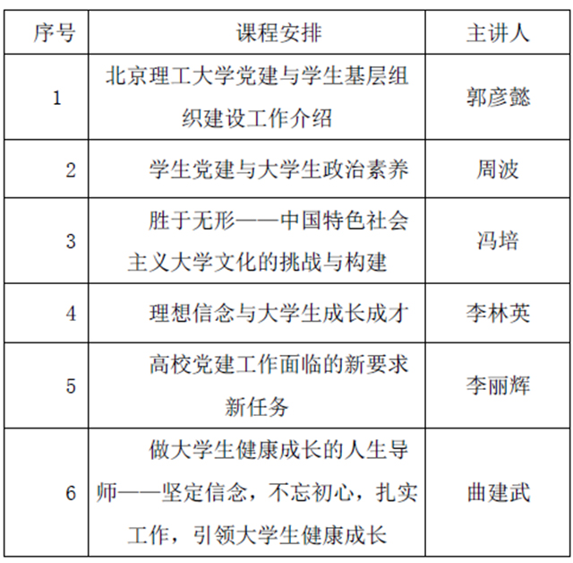 本次專題培訓(xùn)為期四天,先后邀請(qǐng)到了北京理工大學(xué)學(xué)生工作部部長(zhǎng)郭彥懿、北京理工大學(xué)組織部副部長(zhǎng)、黨校副校長(zhǎng)周波、首都經(jīng)濟(jì)貿(mào)易大學(xué)黨委書(shū)記馮培、北京理工大學(xué)馬克思主義學(xué)院院長(zhǎng)、博士生導(dǎo)師李林英、北京市委教育工委組織處處長(zhǎng)李麗輝、大連海事大學(xué)輔導(dǎo)員曲建武教授分別以“我校黨建與學(xué)生基層組織建設(shè)工作介紹”、“高校黨建工作面臨的新要求新任務(wù)”、“勝于無(wú)形——中國(guó)特色社會(huì)主義大學(xué)文化的挑戰(zhàn)與構(gòu)建”、“理想信念與大學(xué)生成長(zhǎng)成才”、“學(xué)生黨建與大學(xué)生政治素養(yǎng)”和“做好大學(xué)生健康成長(zhǎng)的人生導(dǎo)師”為主題做了4場(chǎng)專題報(bào)告、2場(chǎng)經(jīng)驗(yàn)交流。