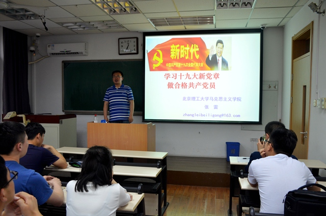張雷帶領(lǐng)同學(xué)們深入學(xué)習(xí)了十九大新修訂的黨章,并回顧了從中共一大到中共十九大黨章的每一次修訂,深入地分析了每個(gè)時(shí)期黨章的變化。他還給同學(xué)們分享了自己學(xué)習(xí)黨章、學(xué)習(xí)理論知識(shí)的方法,用“組織上入黨一生一次,思想上入黨一生一世”勉勵(lì)同學(xué)們,不斷武裝思想,堅(jiān)定信念,做時(shí)代新人。