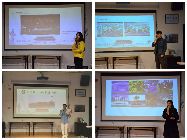 在新中國成立70周年慶?;顒又?,4631名北理工師生光榮參與國慶盛典,傳承紅色基因,書寫精彩華章。參與新中國成立70周年慶?;顒拥?名學生向退休老黨員介紹自己在盛典中承擔的工作內容,以及工作感悟。毛藝軒和榮錕介紹了所在的數字表演與虛擬仿真技術組在群眾游行、聯歡晚會創意及排練、集結疏散、觀禮人員服務、電視轉播機位等任務中的仿真工作;張倩倩講述了澳門“蓮花綻放”游行彩車設計的背景、過程和體會;蔣智穎分享了“與時俱進”群眾游行方陣從排練到國慶當天的故事;楊靜嫻回顧了國慶聯歡活動的場景和感受。