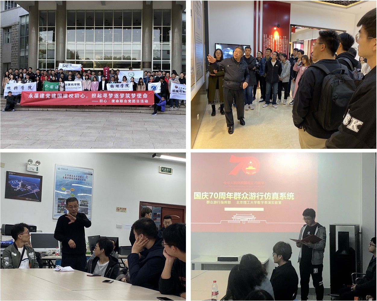 本次展覽共有來自21個單位的1000余名黨團員參觀,其中教職工近300人,學生近800人。在吸引師生們作為參觀者接受教育的同時,物理學院黨委還發揮教師黨員的教育引領作用,邀請了物理學院退休黨員范天佑老師、自動化學院退休黨員李兆民老師、留學生中心謝非老師與師生黨團員們分享參展學習體會;在“初心、使命”聯合黨團日活動中,邀請了計算機學院黨委書記丁剛毅教授介紹國慶70周年慶祝活動、邀請校史館王民館長為學生做校史講解……教師們結合自己的工作實際現身說法,使得教育內容更加鮮活,增強了教育效果,發揮了教育實效。