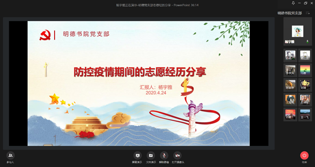 為深入學(xué)習(xí)貫徹習(xí)近平總書記重要回信精神,持續(xù)推進(jìn)新時(shí)代愛國(guó)主義教育,積極響應(yīng)“擔(dān)復(fù)興大任,做時(shí)代新人”主題教育活動(dòng)號(hào)召,教育引導(dǎo)廣大青年黨員將習(xí)近平總書記回信精神作為人生指引,以實(shí)際行動(dòng)升華學(xué)習(xí)成果、篤行強(qiáng)國(guó)使命,4月24日,明德書院黨支部開展“共學(xué)回信精神,同擔(dān)時(shí)代大任”線上主題黨日活動(dòng),支部全體黨員參加了此次活動(dòng)。活動(dòng)主要分為學(xué)習(xí)習(xí)近平總書記回信,分享個(gè)人抗“疫”故事以及主題討論三個(gè)部分。黨員們學(xué)習(xí)理論、交流想法、暢所欲言,收獲頗豐。