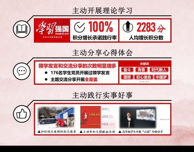 可視化的“一體化教育管理”試行一學期以來,取得了顯著的成果。各支部的組織生活形式更加豐富,學生黨員對理論學習的積極性更高。其中,集體理論學習中領學發言和交流分享的次數明顯增多。學生黨員更加重視通過學習強國平臺進行理論學習,學習強國積分階段性增長3000分以上的有92人,人均增長2283分,學習強國積分增長承諾踐行率為100%。志愿服務意識明顯增強,學生黨員積極擔任社區疫情防控志愿者、校慶活動志愿者的人數逐步提升,更多黨員主動開展朋輩引導、科普宣講,黨員先鋒模范作用進一步增強。