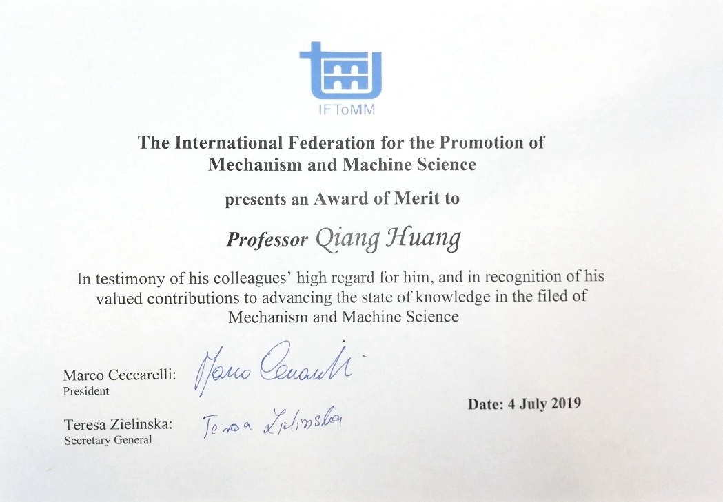 北理工黃強教授榮獲國際機構學和機器科學聯(lián)合會(IFToMM)“卓越成就獎”