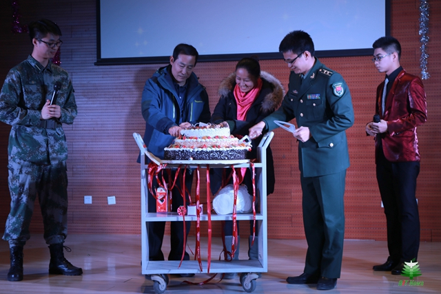 最令人感動與驚喜的,是晚會預設的神秘環節。選培辦為大家準備了生日蛋糕,這是對國防生元旦晚會十周年的獻禮,象征著歷屆國防生的成長和進步,同時也飽含了對所有在校國防生美好未來的祝福。秦主任、許副處長與國防生家長代表親自為大家切分蛋糕,寓意每一名國防生的成長都離不開選培辦領導、學校領導和學生家長的關懷與培養。秦主任贊揚了國防生牢記使命、不負重托的精神,肯定了2015年國防生完成的各項任務,并鼓勵全體國防生為了心中的夢想刻苦奮進,努力打造北理工國防生品牌。學生工作處副處長許欣老師稱贊了國防生敢為人先的良好形象,激勵大家在學校努力學習、做好榜樣,在部隊建功立業、成為棟梁。2015級國防生金哲毅的父親金連柱代表國防生家長對選培辦與學校的辛勤培育表示感謝,對國防生的茁壯成長寄予厚望。