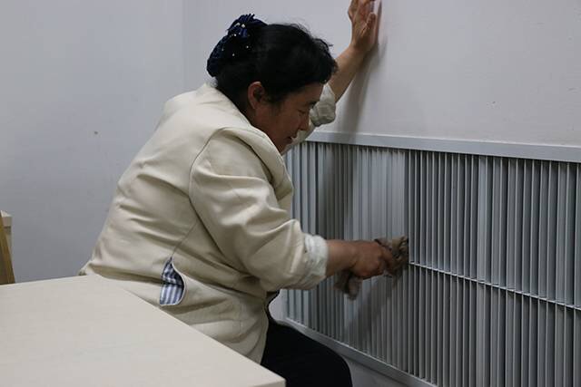 在圖書館見到這位阿姨的時候,她正在一遍又一遍地擦洗著百葉窗。看到我們的鏡頭,阿姨沖我們笑笑,小聲說道:“別拍我了,沒啥好看的。”