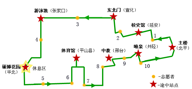 比賽全程根據我校不同時期的校址設置了北平站(主樓)、延安站(校史館)、宣化站(東北門)、張家口站(游泳池)、華北站(碩博花園)、平山縣(體育館)、邢臺站(中心教學樓)及井陘站(中心花園噴泉),共八站。將教育性和趣味性相結合,在不同站點設置了智力問答、趣味跳繩和五人六足等游戲環節,使同學們不僅鍛煉了身體,同時也提高了對校情校史及“一二九運動”的認識與理解。