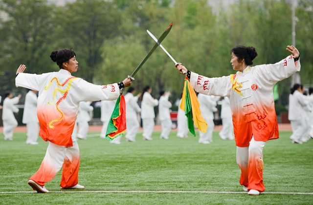 伴著熱烈的掌聲與歡呼聲,精彩的體育表演開始。白鶴翱翔,飄逸飛揚,由我校300余名教職工組成的表演團隊為大家奉獻了精彩的太極拳表演。場地中間10位北理工太極拳協會隊員,為大家展示陳式太極刀組合,刀法游刃有余,氣勢雄壯,銳不可當。