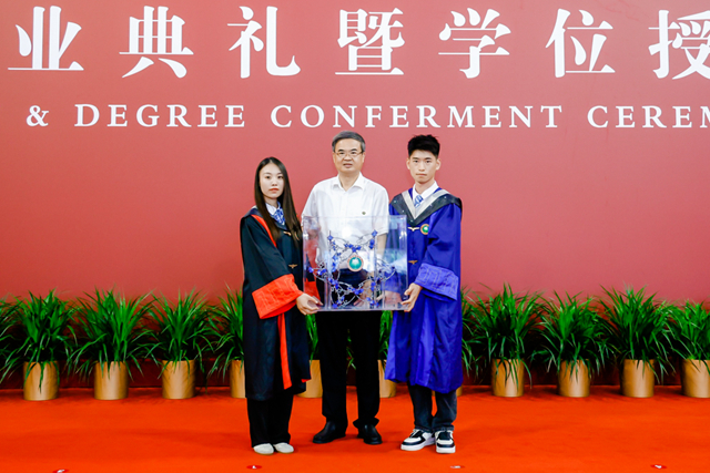 校黨委書記張軍向畢業生代表贈送學位服和畢業禮物,定制學位服和畢業紀念徽章以校徽、雄鷹、飛鴿為元素,是充滿北理工特色的獨家記憶,希望同學們整裝待發,展翅翱翔,努力成長為各行各業的領軍領導人才。化學與化工學院畢業生代表向母校贈送BIT-66分子結構模型,感激母校為學子成長成才搭建了科研報國的廣闊舞臺,祝愿母校矢志一流、蒸蒸日上。