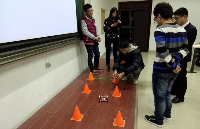 11月19號,“world of tank”遙控小車比賽在理教404、405教室火熱進行,第一場活動優勝的40組選手進入了第二階段比賽。相對比之前的比賽,本次遙控小車比賽,零件數量更多、技術要求更高,而每組選手也愈發專注、團結一致,分工明確:一人雙手拿設備,細致的繞著銅絲,制作動力之源——馬達;一人各種工具并用,一點點地拼接車體,調整零件位置;一人仔細地拼接電路,不斷測試。最后40輛小車陸續開上了賽道展開時間與速度的競技,并由專業評委打分確定了可以晉級最終決賽的30組名單。