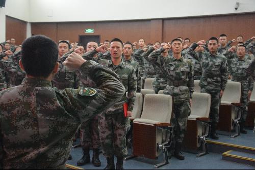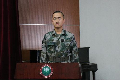 2016級新生張學頂代表全體國防生發言,他承諾堅定理想信念、打牢專業基礎、鍛煉過硬作風,用堅實的肩膀扛起富國強軍的重任。全體國防生滿懷攜筆從戎的決心,在16中隊中隊長葉云的帶領下莊嚴宣誓,志愿成為光榮的中國國防生。