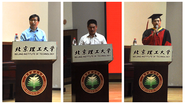 郭德洲同學代表2017年夏季畢業(yè)研究生發(fā)言,他通過回憶在菁菁校園中成長的點滴向母校、領(lǐng)導和老師們表示了深深的感謝和崇高的敬意,并祝愿北京理工大學和機電學院蒸蒸日上,續(xù)鑄輝煌,祝福老師身體健康、萬事如意,祝愿2017屆全體畢業(yè)生揚帆遠航、鵬程萬里。王海福教授是機電學院兵器科學與技術(shù)學科特聘教授、博士生導師,2017年首屆全國創(chuàng)新爭先獎獲得者,2016年國家技術(shù)發(fā)明獎二等獎獲得者,毀傷與彈藥工程系主任,本次典禮中作為教師代表發(fā)言。他引用《周易》中的“天行健,君子以自強不息。地勢坤,君子以厚德載物。”表達自己對畢業(yè)生們的殷切期許,希望同學們都能成為自強自立、具有深厚品德的祖國棟梁。王老師還教導畢業(yè)生們要懂得感恩,要對國家和學校的培育常懷感恩之心,要用自身行動來踐行這一份感恩之情。隨后,機電學院院長陳鵬萬致辭,他對畢業(yè)生們提出三點希望,即“希望同學們樹立崇高的理想;希望同學們勿忘科研精神;希望同學們?nèi)魏螘r候都要勇于擔當”,并祝愿同學們身體健康、生活愉快,在未來的旅程中努力拼搏,用自己的力量回饋社會,成為一個對社會有貢獻的人。