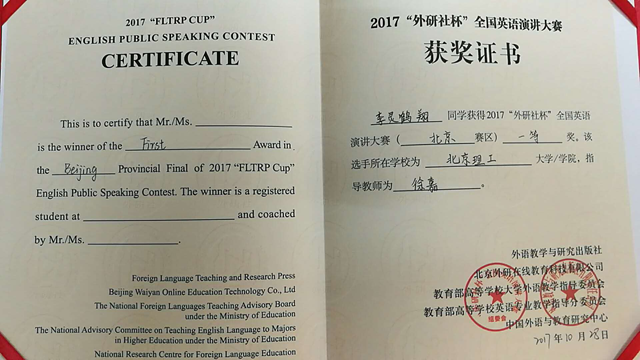 北京理工大學選手喜獲“外研社”杯英語演講比賽一等獎