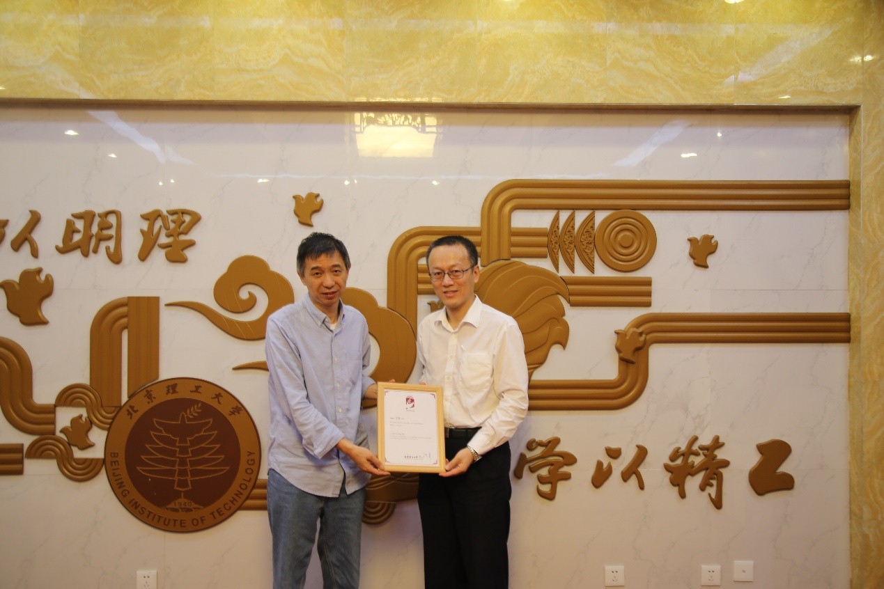 講座前副校長龍騰為王堅博士頒發了北理工“百家大講堂”講座紀念證書。
