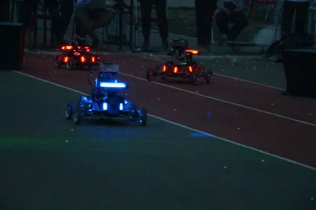夜幕降臨,一輛輛戰車在場內走位、射擊,機器人身上的“血量”顯示板和發射的紅綠光線在晚上顯得清晰異常,圍場內機器人大戰硝煙四起,機器人靈活的“漂移”和精準的射擊,讓整個賽場變成了五彩繽紛的光影世界,絢麗多彩,熱鬧非凡……操控手們都在聚精會神、全力以赴,觀眾則在兩位解說員幽默風趣的講解下看得津津有味。
