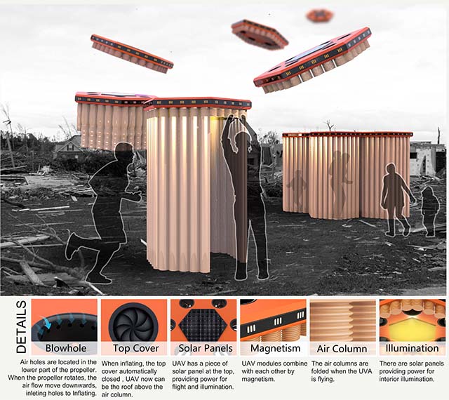 “LIFE HIVE”(蜂巢救災(zāi)無(wú)人機(jī)系統(tǒng))的設(shè)計(jì)靈感來(lái)源于對(duì)災(zāi)區(qū)救災(zāi)過(guò)程的思考和人文關(guān)懷。Life Hive創(chuàng)新的將無(wú)人機(jī)應(yīng)用于建筑方面,利用模塊化無(wú)人機(jī)靈活的飛行優(yōu)勢(shì),搭載能力實(shí)現(xiàn)災(zāi)區(qū)帳篷的快速搭建,有效提高救災(zāi)質(zhì)量。傳統(tǒng)的救災(zāi)方式中,災(zāi)區(qū)的帳篷的補(bǔ)給依賴(lài)于傳統(tǒng)的運(yùn)輸工具以及路況。但災(zāi)區(qū)的路況惡劣且十分不穩(wěn)定,帳篷經(jīng)常得不到及時(shí)有效的供給。同時(shí)傳統(tǒng)的帳篷搭建較為繁瑣,耗時(shí)較長(zhǎng)。同時(shí)傳統(tǒng)的帳篷均為大通鋪的形式,無(wú)法實(shí)現(xiàn)對(duì)個(gè)人隱私的尊重。此外,傳統(tǒng)的帳篷的設(shè)計(jì)采用單體的設(shè)計(jì)想法,并不能滿(mǎn)足如醫(yī)療站、廁所、家庭居住等不同大小、功能的空間需求。