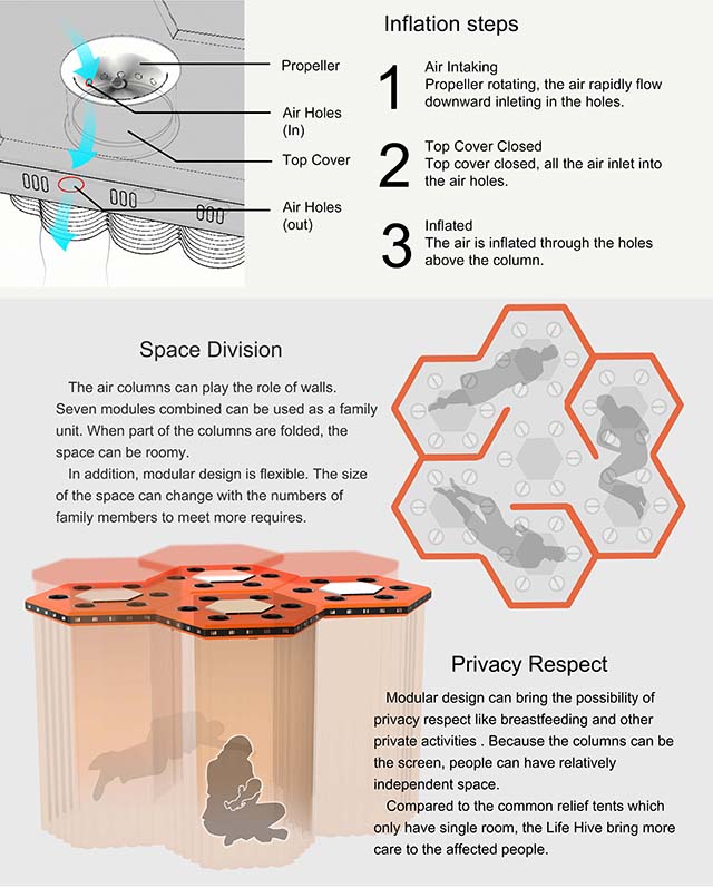 “LIFE HIVE”(蜂巢救災(zāi)無(wú)人機(jī)系統(tǒng))模塊化的設(shè)計(jì)使得帳篷在搭建的過(guò)程當(dāng)中,可以實(shí)現(xiàn)不同的需求,使得救災(zāi)過(guò)程更加的合理衛(wèi)生。例如三個(gè)模塊即可組成臨時(shí)的公廁,七個(gè)模塊即可組成家庭居住單元,更多的模塊則可以搭建成醫(yī)療救護(hù)中心等等。