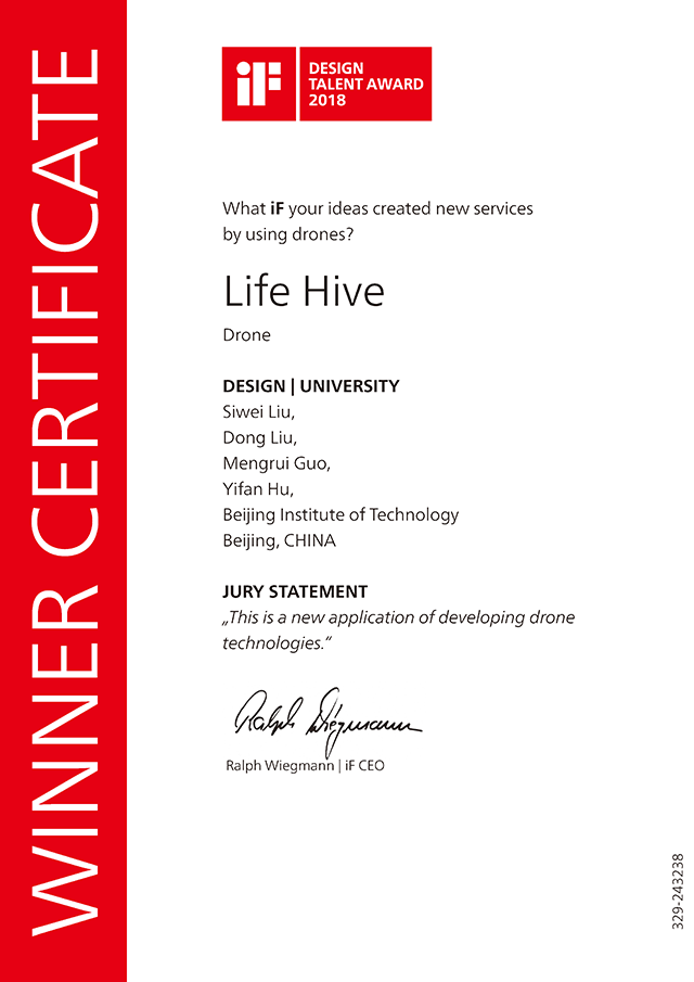 iF新秀設(shè)計(jì)大獎(jiǎng)(IF TALENT AWARD)的評(píng)選聚焦于當(dāng)前最重要的社會(huì)議題,收集有可能改變世界的創(chuàng)新想法,致力于尋找引領(lǐng)未來(lái)產(chǎn)品設(shè)計(jì)方向。 北理工設(shè)計(jì)學(xué)院郭萌睿、劉思維、劉冬、胡一帆四名同學(xué)的設(shè)計(jì)作品“LIFE HIVE”(蜂巢救災(zāi)無(wú)人機(jī)系統(tǒng))參與了四個(gè)類(lèi)型分組中的“新無(wú)人機(jī)服務(wù)”項(xiàng)目角逐,該項(xiàng)目要求探索發(fā)現(xiàn)無(wú)人機(jī)的新服務(wù)項(xiàng)目。作品要在“創(chuàng)新與精致”“美感”“責(zé)任”“功能”和“定位”五個(gè)方面都具有杰出的表現(xiàn),才能獲得該獎(jiǎng)項(xiàng)。